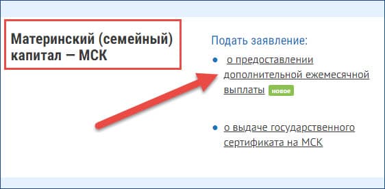 - Далее прокрутите страницу вниз до раздела «Материнский капитал» и нажмите в графе «Подать заявление» на надпись «О предоставлении дополнительной ежемесячной выплаты» (как это показано ниже на скриншоте).