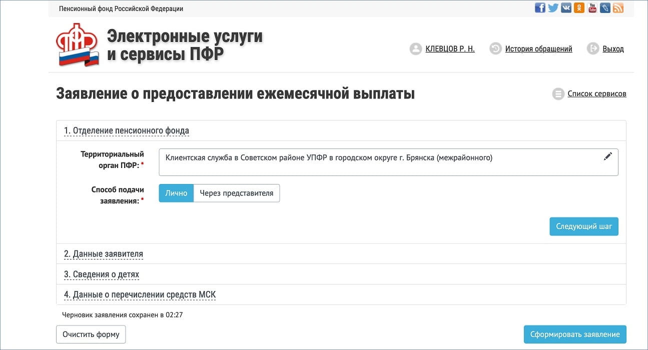- Откроется форма заявления, в ней выбирайте территориальный орган ПФР и способ подачи заявления — лично или через представителя.