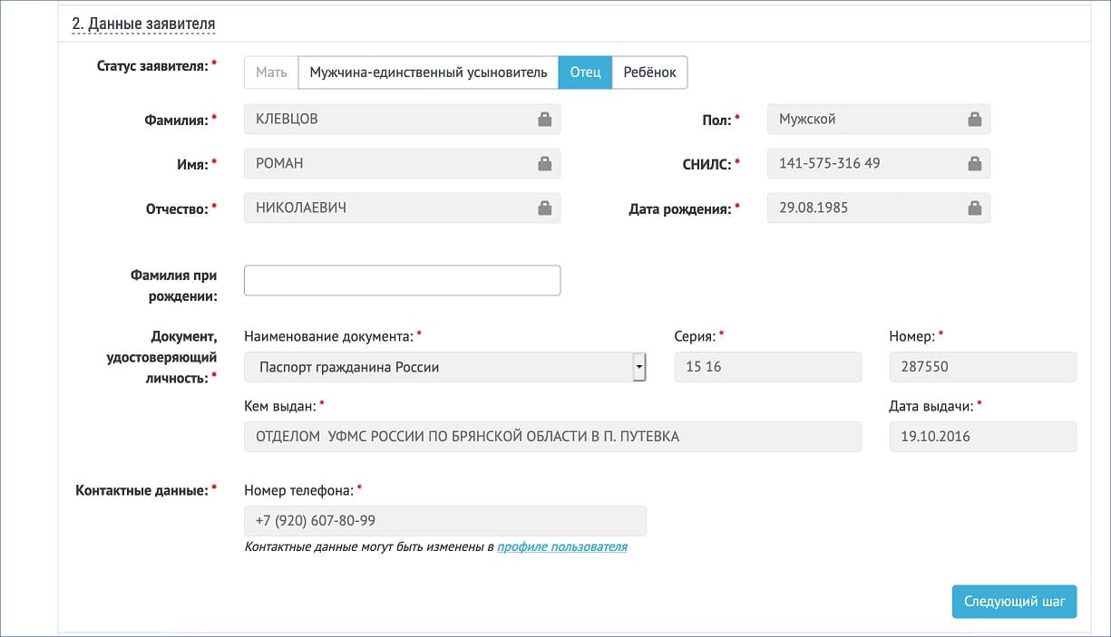 - Дальше нужно заполнить данные заявителя: выбрать статус (мать, отец, мужчина-единственный усыновитель или ребенок), указать свои Ф. И. О., пол, номер СНИЛС, дату рождения, фамилию при рождении (если меняли фамилию), данные паспорта и номер мобильного телефона. Часть данных может заполниться автоматически.