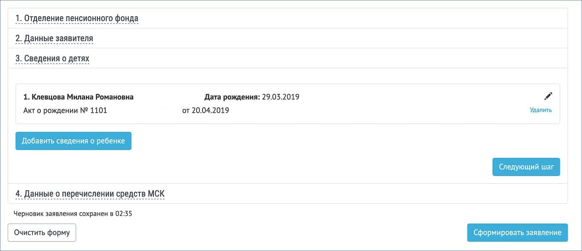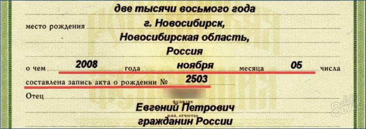 - На следующем шаге укажите данные о ребенке (детях): Ф. И. О., дату рождения, номер и дату акта о рождении. Обратите внимание, что нужно указать не номер свидетельства, а именно номер акта о рождении! На скриншоте показано, где он находится в свидетельстве о рождении.