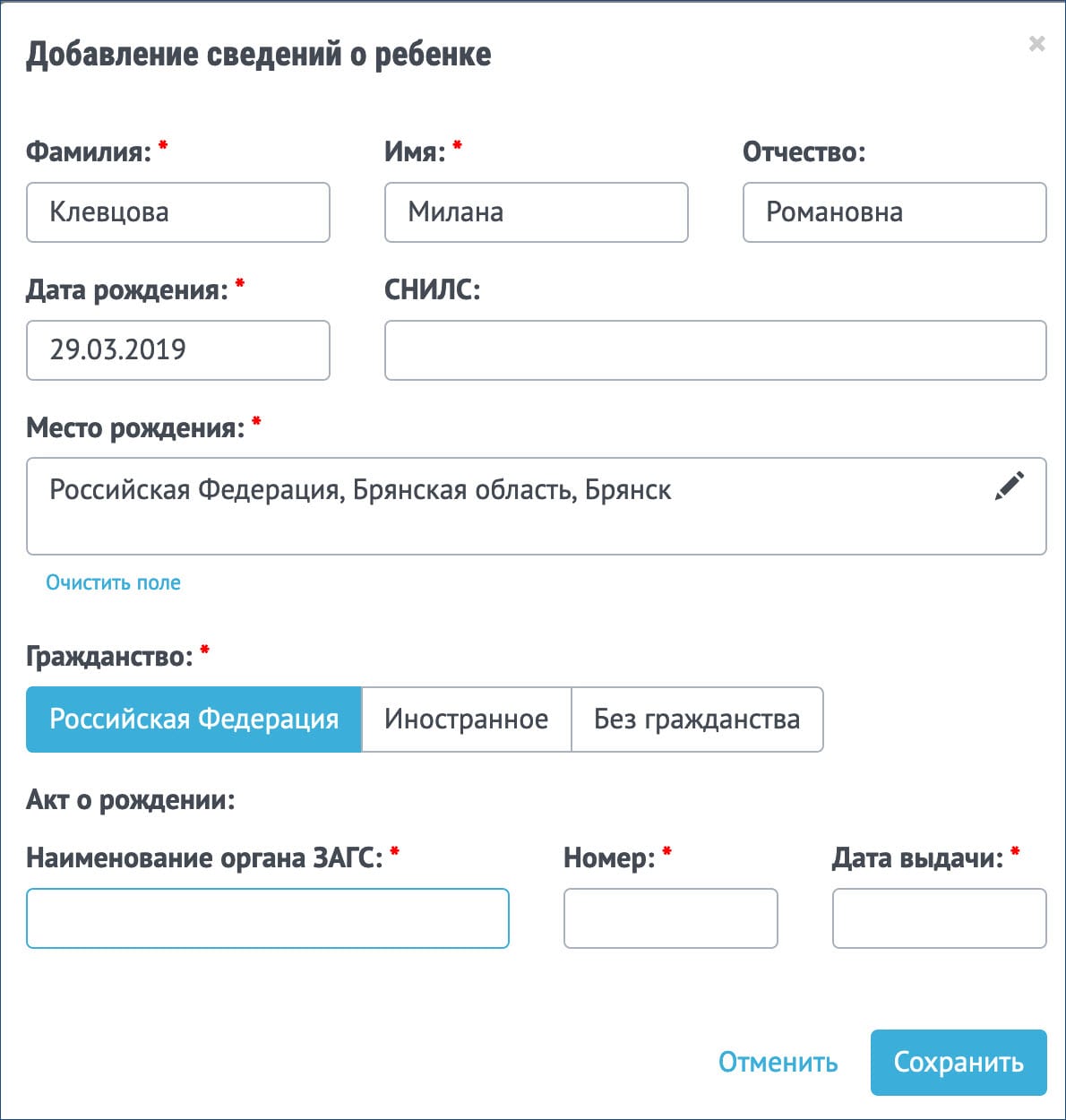 В заявлении это будет выглядеть, как показано ниже. Номер СНИЛС ребенка заполняется, если есть.