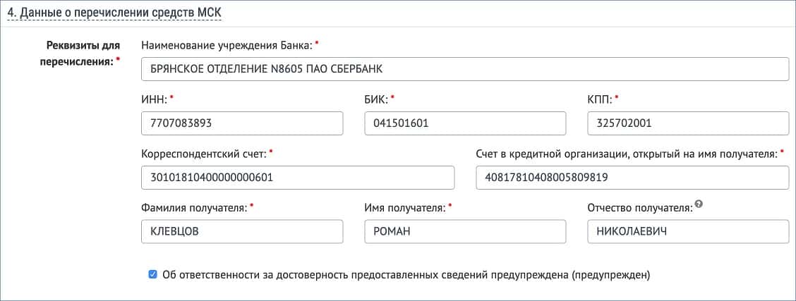- Далее нужно заполнить банковские реквизиты, на которые будут перечислять деньги. Их можно посмотреть в интернет-банке или в мобильном приложении банка, картой которого вы пользуетесь. Важно заполнить все поля, как это показано на рисунке ниже.